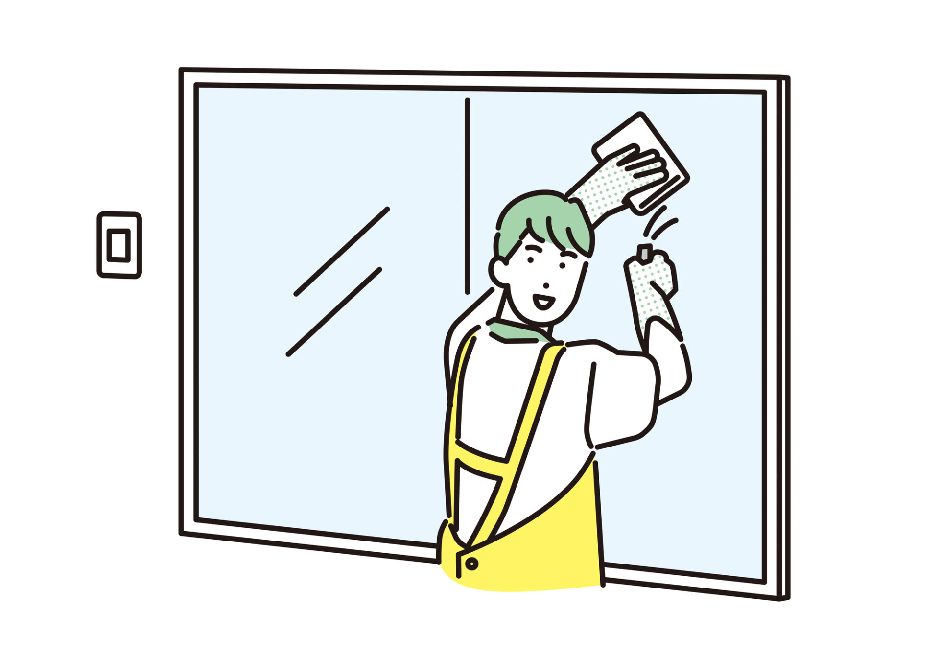 ガラス両面とサッシ溝を洗浄し、専用スクイジーで拭き上げ。網戸も取り外して水洗い可能。