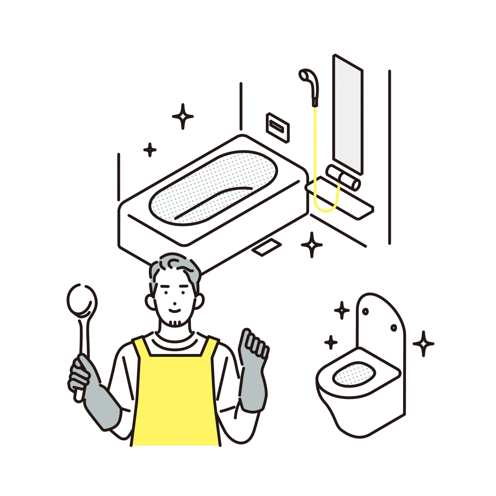 天井〜床・ドアパッキンまでカビ・水垢・皮脂を素材別洗剤で洗浄。鏡のウロコも研磨し、清潔な浴室に再生します。